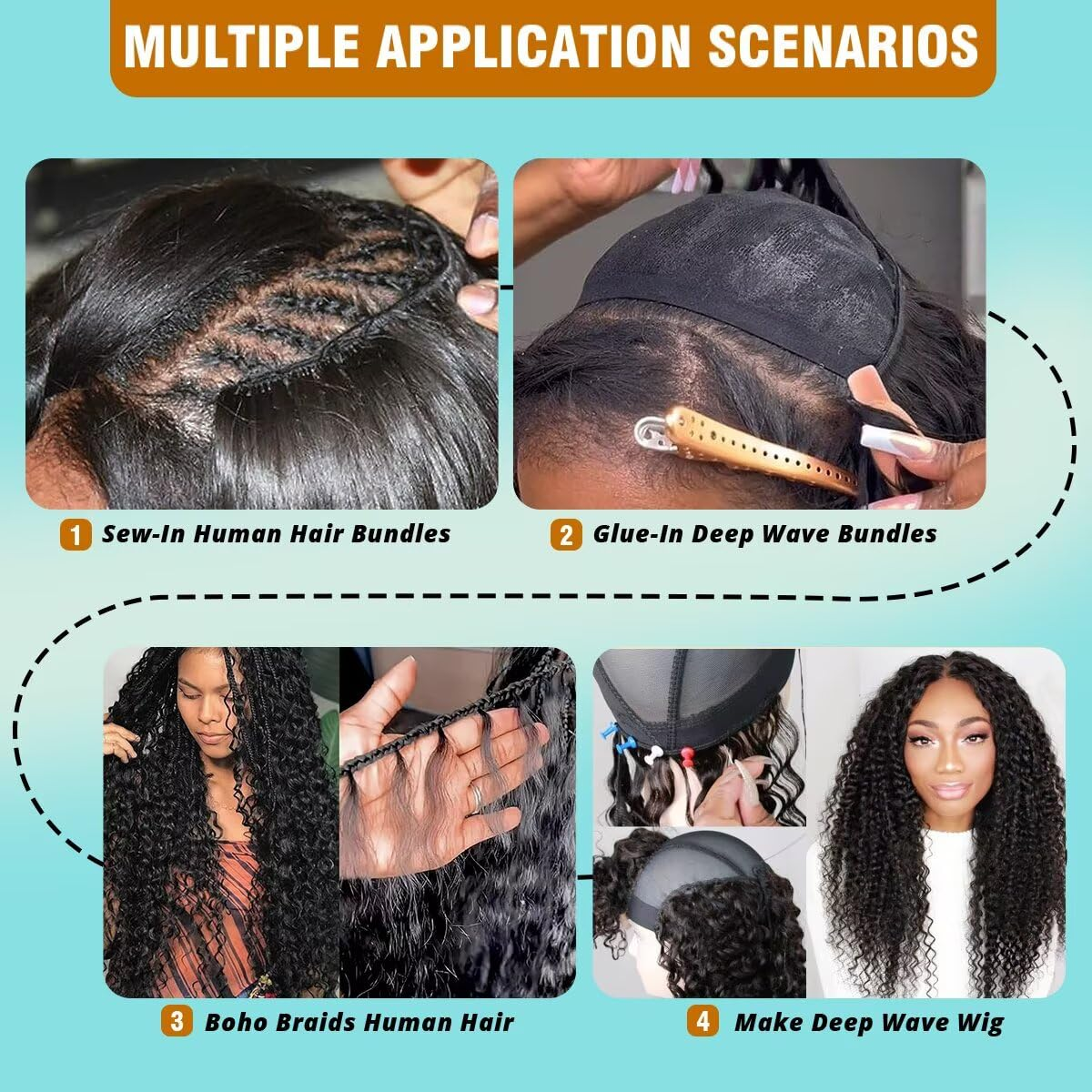 - Human Hair Bundles Deep Wave Color: Natural Black Color, Can be Dyed and Bleached. Easily Blended with Your Original Hair, Usually It Is Enough for Full Head. Can be Straightened, Permed, Bleached, Highlighted,Curled Or Styled As Your Own Hair.
