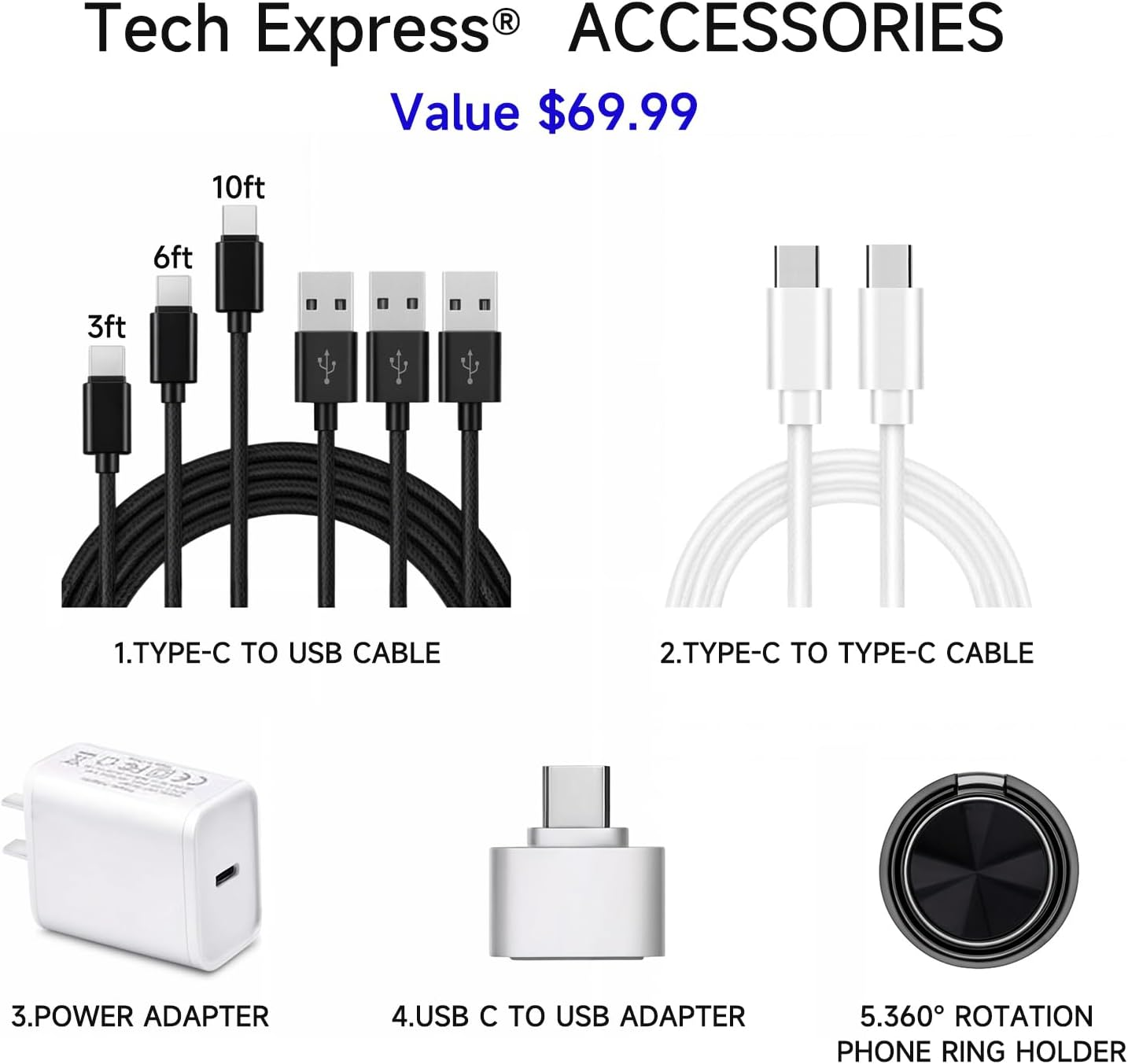 ✔ Bonus Accessories Included – Get more value with essential extras: Type-C to USE cable, Type-C to Type-C cable, Power Adapter, USB C to USB Adapter, 360° Rotation Phone Ring Holder.