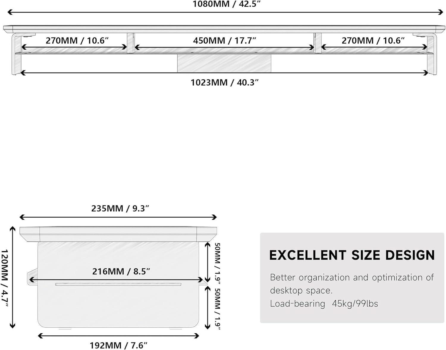 • 【Sturdy & Stable】: Monitor riser is 42.5 x 9.3 x 4.7 inches, with a board thickness of 0.7inches/18mm, and the middle layer is embedded with a whole piece of steel. The leg is made of 0.31inches/8mm high-quality acrylic material, the maximum load capacity is 45kg/99lbs, can easily handle either laptops or heavy monitors.