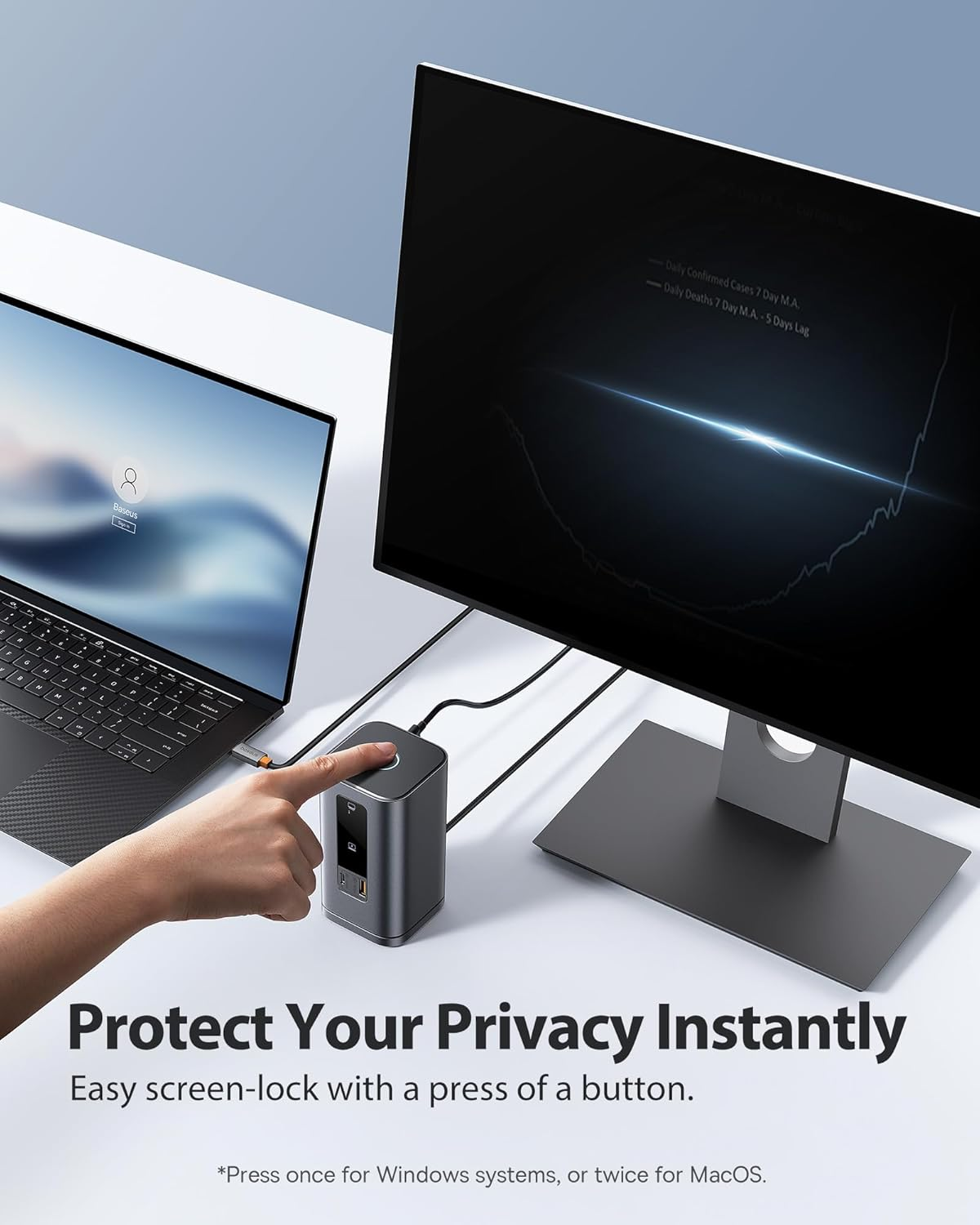 - Innovative Upright Design & Screen-lock Button : Compact vertical laptop docking station with sleek aluminum finish, 80cm cable and a magnetic base, redefine your workspace. Vertical expansion space provides a larger usage range for your desktop. The built-in LED digital screen displays the connection status of each port. Use the screen-lock button to secure sensitive information whenever needed