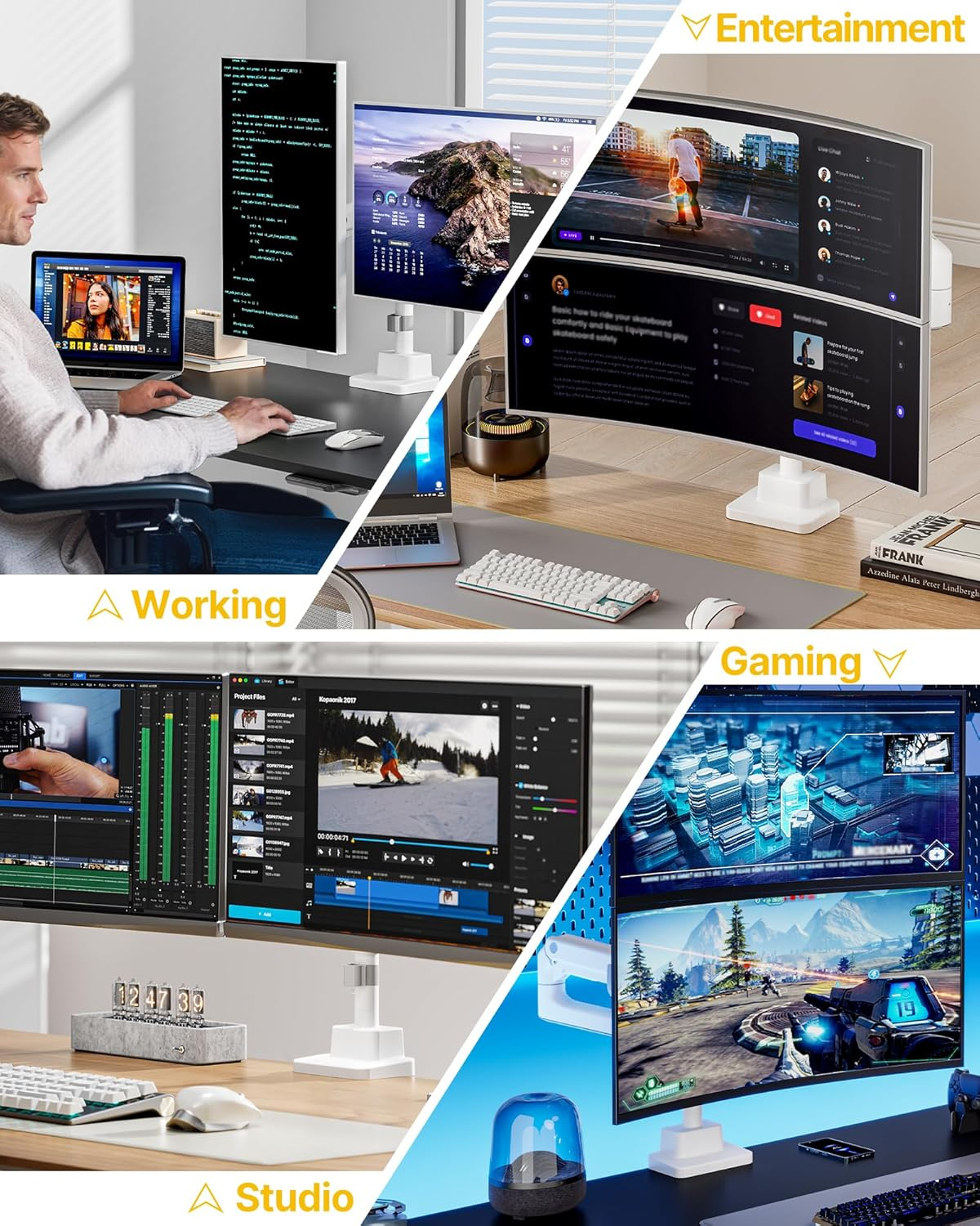 - 【Universal Compatibility & Stability】Engineered for ultimate adaptability, this dual monitor arm supports 17″ to 57″ curved screens with VESA patterns from 75x75mm to 100x100mm. Compatible with major brands like Samsung and LG, its heavy-duty aluminum construction ensures rock-solid stability and supports up to 59.4 lbs