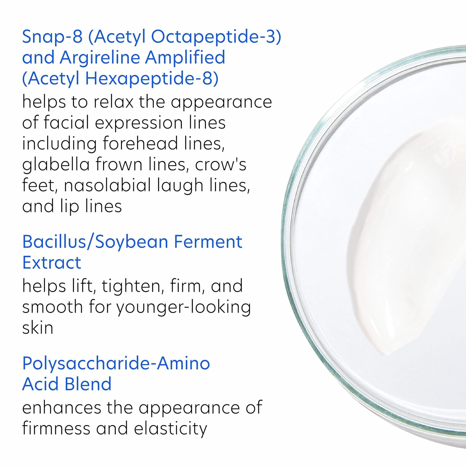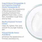 Anti-aging Fine line reduction with the addition of hydrolyzed hyaluronic acid | Anti-aging Blocks the glycation process to minimize age-relating skin yellowing & dullness | Anti-aging Smooth, hydrate and define facial contours for a younger-looking complexion |