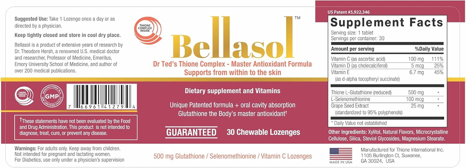 - Superiority: Bellasol is the first and only Glutathione formula in chewable LOZENGE form, better than other tablets, capsules due to better absorption of Glutathione in Buccal cavity that directly goes into the blood stream and bypassing the GI tract.