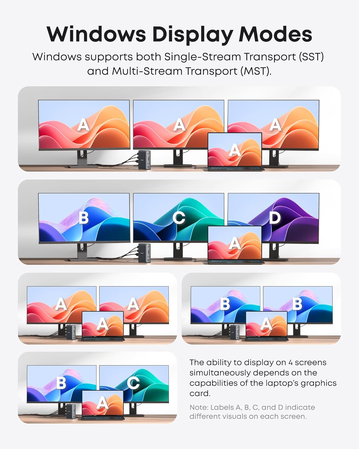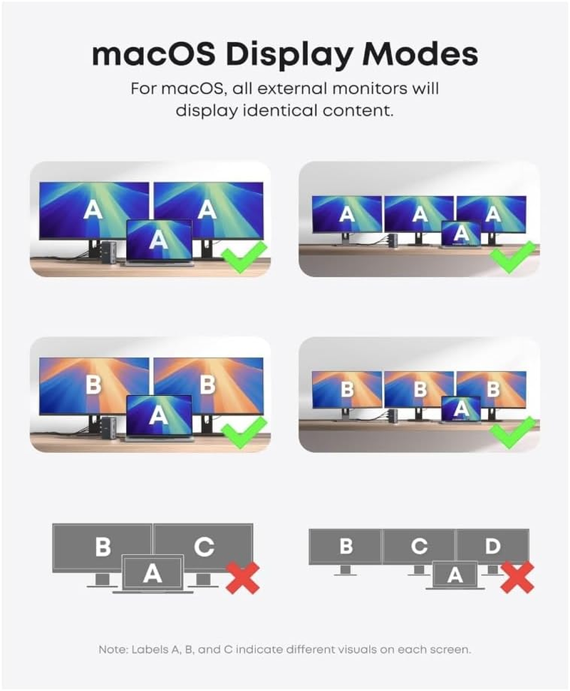 • Display Information: macOS and iPadOS only support Single-Stream Transport (SST) mode, which means all connected monitors will show the same content.