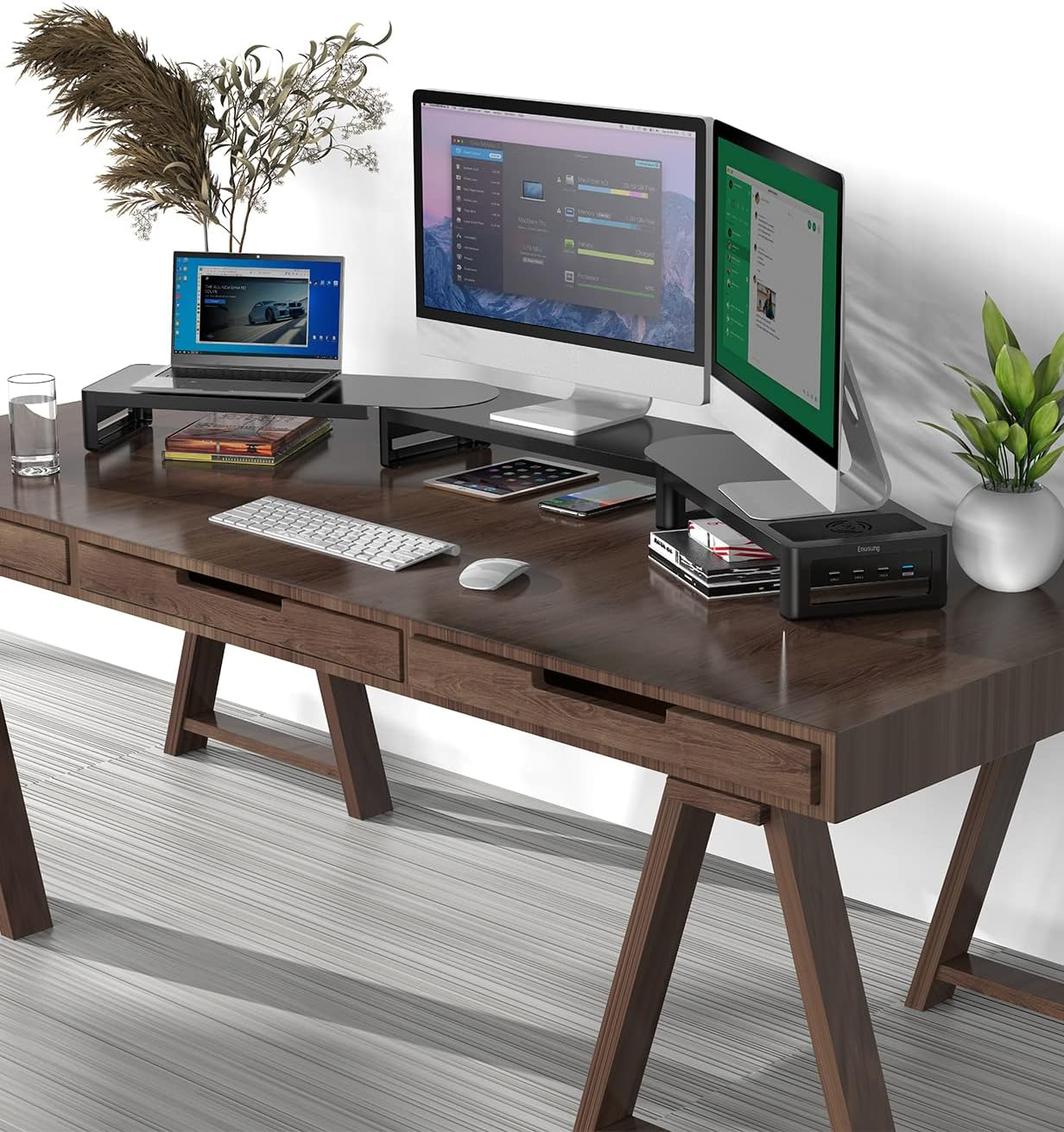 Dual Monitor Stand, Monitor Stands Riser for 2 Monitors, 42.5 Inch Wood Desk Shelf with Storage Organizer and Cable Management for Office Desk Accessories