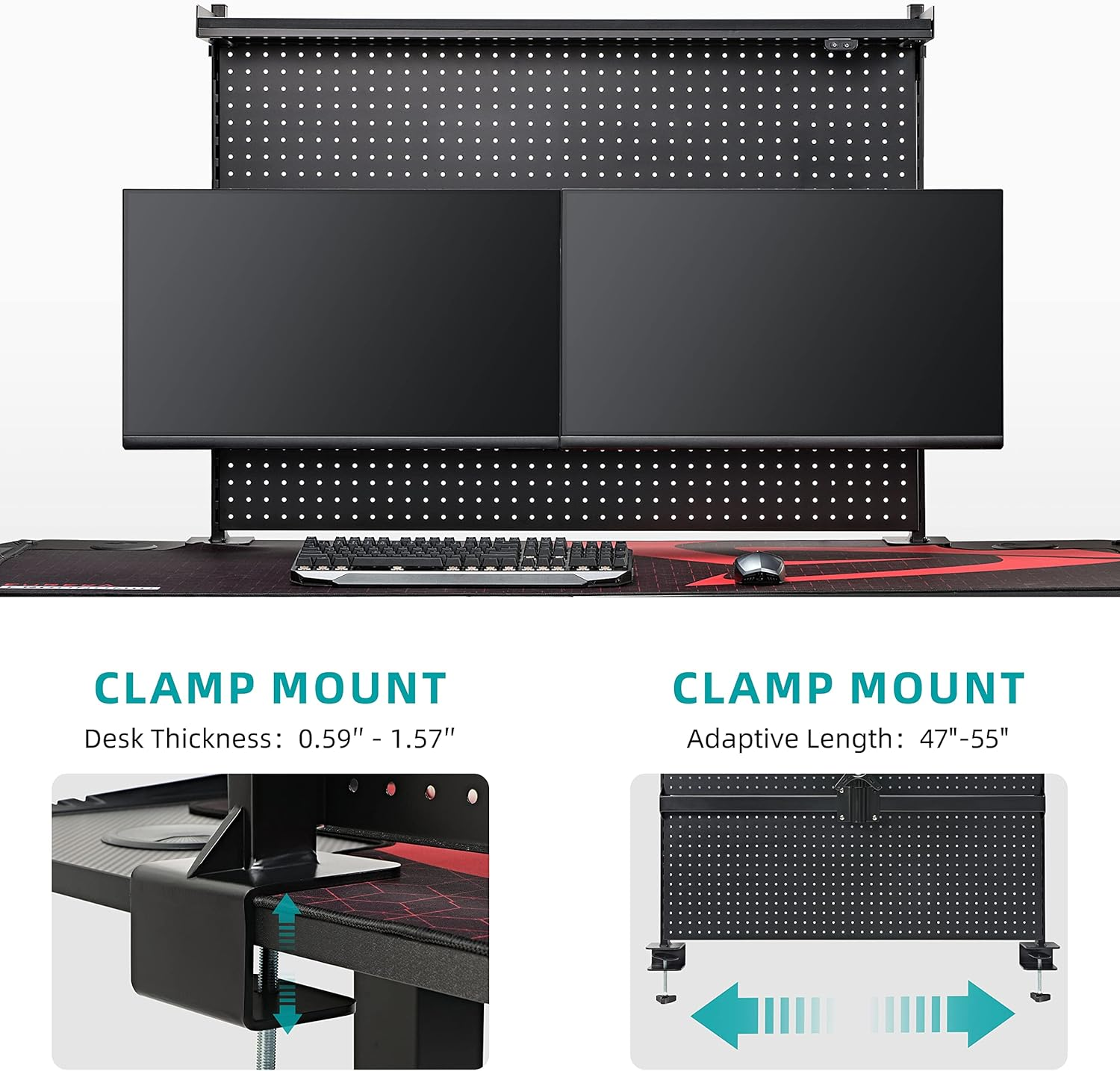 - Clamp-on Pegboard -Expand your workspace without drilling into your desk with the innovative clamp-on pegboards. Bring the functionality of a pegboard to your workstation without the hassle of wall mounting. The desk pegboard is suitable for most computer desks, gaming desks, standing desks, adjustable desks, and other desks made of hard materials (except fragile materials such as glass). Optimum desk thickness is 0.59″-1.57″ and maximum thickness is 1.77″.